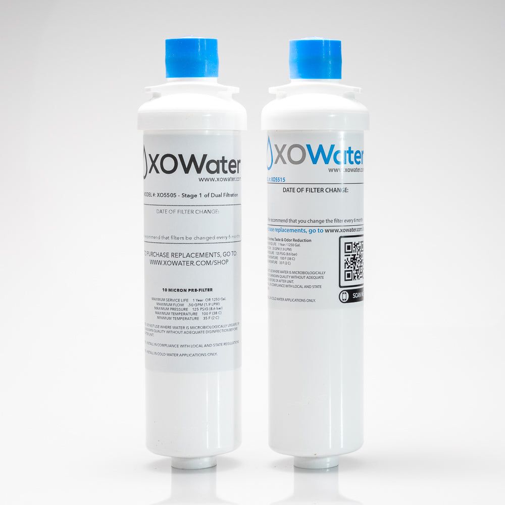 This replacement filter set includes one XO5515 and one XO5505 filter, designed for coolers with the Dual Filtration Upgrade seen pictured here. Verify your current filter model numbers before ordering to ensure compatibility. For assistance, call (800) 515-0324.