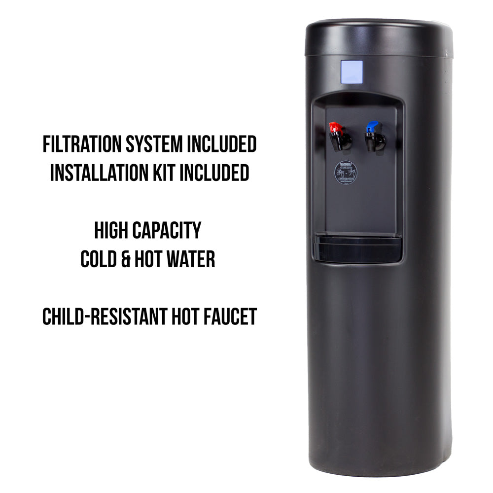 Instant Cold Water Faucet Instant Hot Water Child-Resistant Faucet 100% Stainless Steel Cold & Hot Reservoirs Protects Water Purity & Cooler Longevity 1,200 Gal. Water Purification System Installation Kit Dimensions 12 × 12 × 40 in One piece UV-protected high density polyethylene(HDPE) blow cabinet. Eliminates...